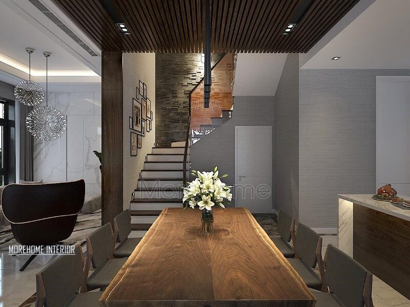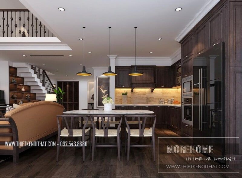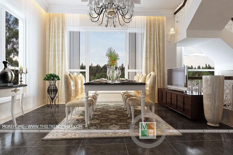 Bàn ăn thiết kế vừa phải gia chủ tránh được cảm giác xa cách trống trải mà vẫn rất gần gũi vơi nhau, bàn tiệc lúc nào cũng tràn ngập sự ấm cúng
