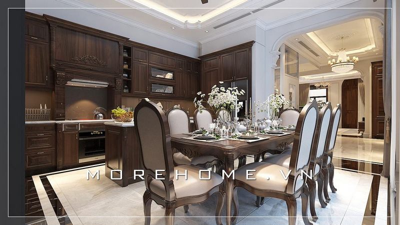 Mẫu bàn ăn gỗ tự nhiên cho phòng ăn biệt thự với thiết kế tân cổ điển sang trọng và đẳng cấp