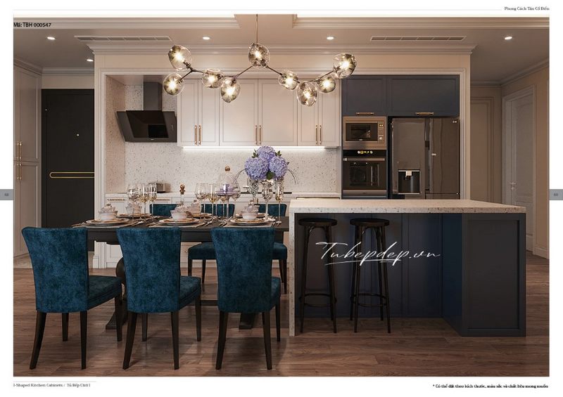 Cách bố trí không gian phòng bếp - phòng ăn liền nhau giúp tiết kiệm diện tích cho căn hộ đặc biệt nổi bật là bộ bàn ghế bọc nhung xanh cuốn hút