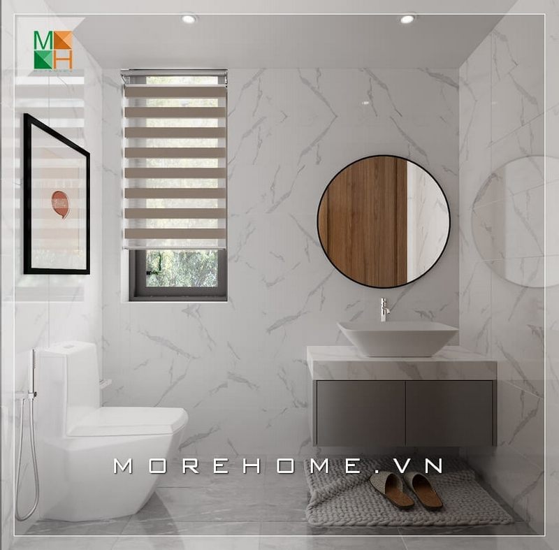 Mẫu gương tròn độc đáo là điểm nhấn ấn tượng trong thiết kế nội thất phòng tắm hiện đại của biệt thự, nhà phố