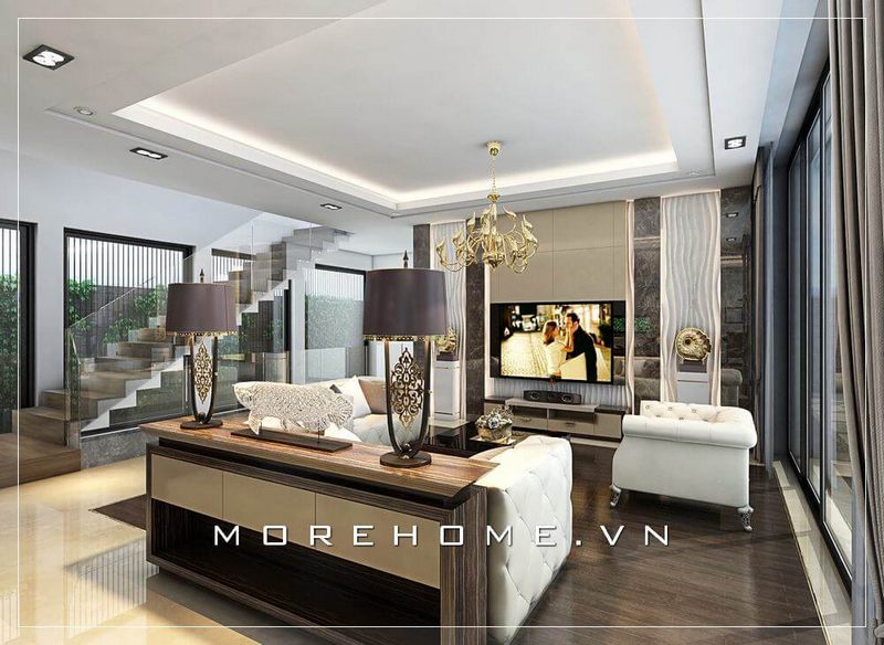 Morehome gợi ý cho bạn mẫu thiết kế nội thất phòng khách chung cư, nhà phố tiện nghi và sang trọng mang phong cách tân cổ điển.