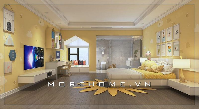 Thiết kế phòng ngủ trẻ em đầy ấn tượng, gam màu vàng mang lại cảm giác dịu nhẹ, không tạo cảm giác chói mắt cho người nhì