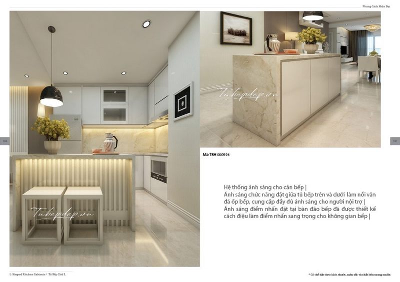 Mẫu tủ bếp chữ L hiện đại có màu trắng tinh tế, trẻ trung đồng bộ với cả không gian là lựa chọn thông minh của gia chủ cho phòng bếp chung cư