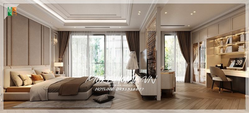 Vách ngăn cnc mạ vàng sẽ được sử dụng để phân chia không gian làm việc và phòng ngủ, mang đến sự sang trọng cho không gian căn phòng.